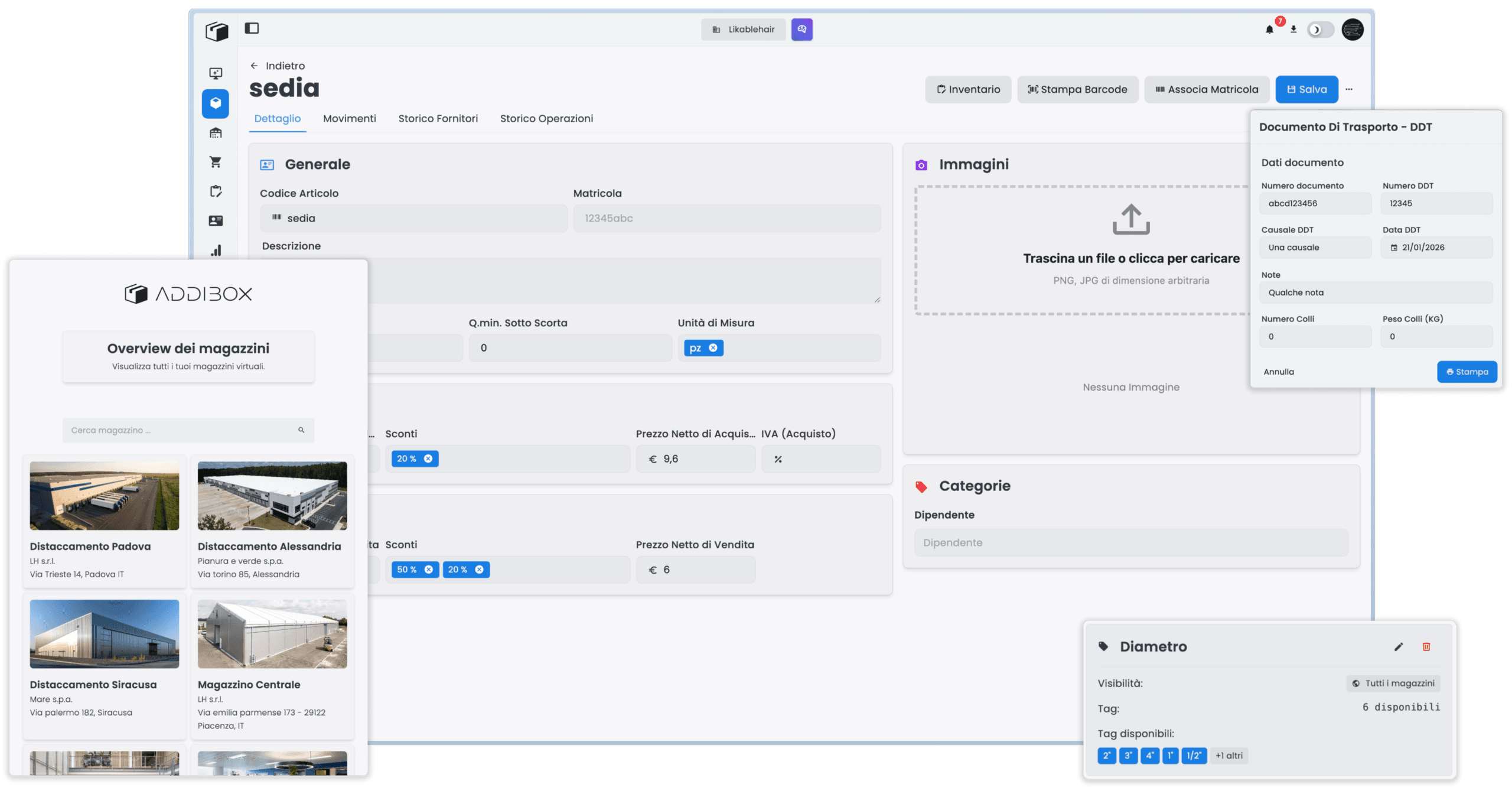 Addibox semplifica la gestione delle categorie e dei tag, permettendoti di organizzare il tuo inventario in modo preciso e intuitivo, potrai gestire categorie e tag con facilità, assicurando un controllo completo e aggiornato dell'intero magazzino.